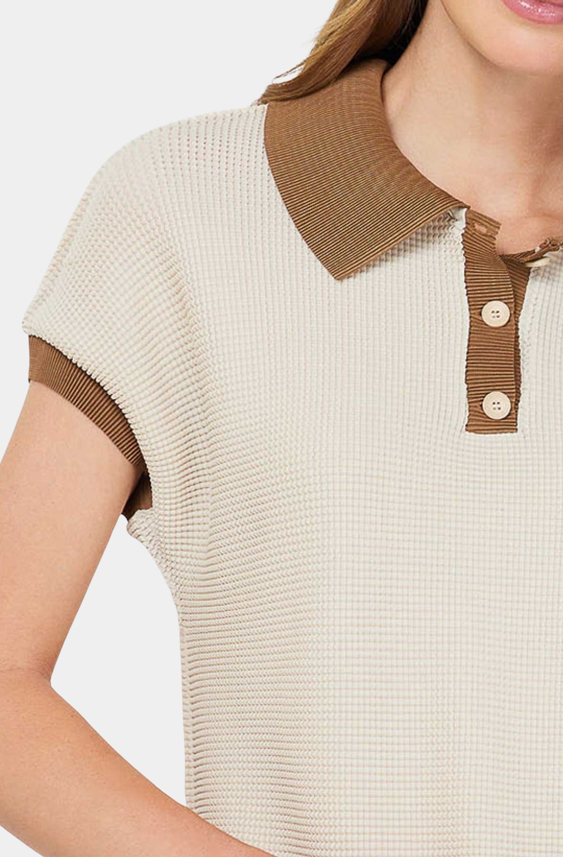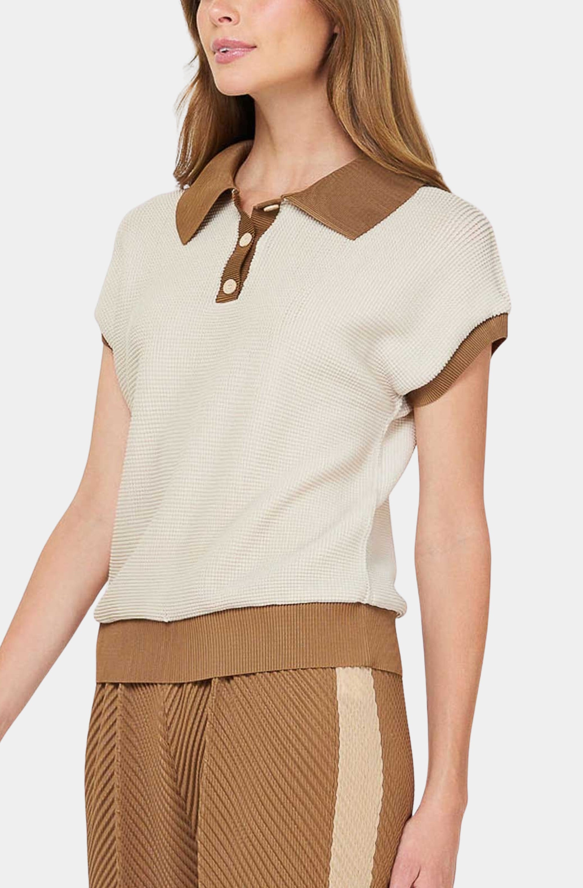 The Valeria Top blends beige and brown tones in a pleated, short-sleeve design. A henley neckline and contrast collar give it a modern look, while the soft, stretchy fabric keeps you comfortable all day. Easy to match with any bottoms for a simple, stylish outfit.