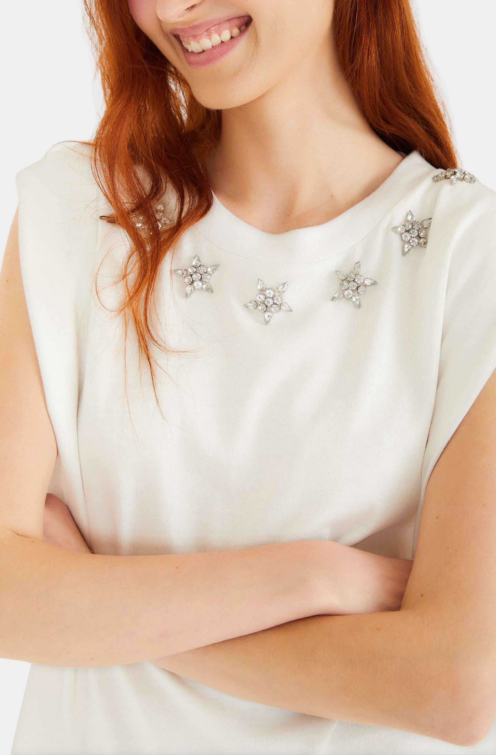 Elevate your basics with the Sparkling Off-White T-Shirt. The shimmering crystals elevate this classic white tee, making it an eye-catching choice for any occasion. Its boxy fit ensures a relaxed yet trendy silhouette, perfect for pairing with your favorite jeans or skirts.