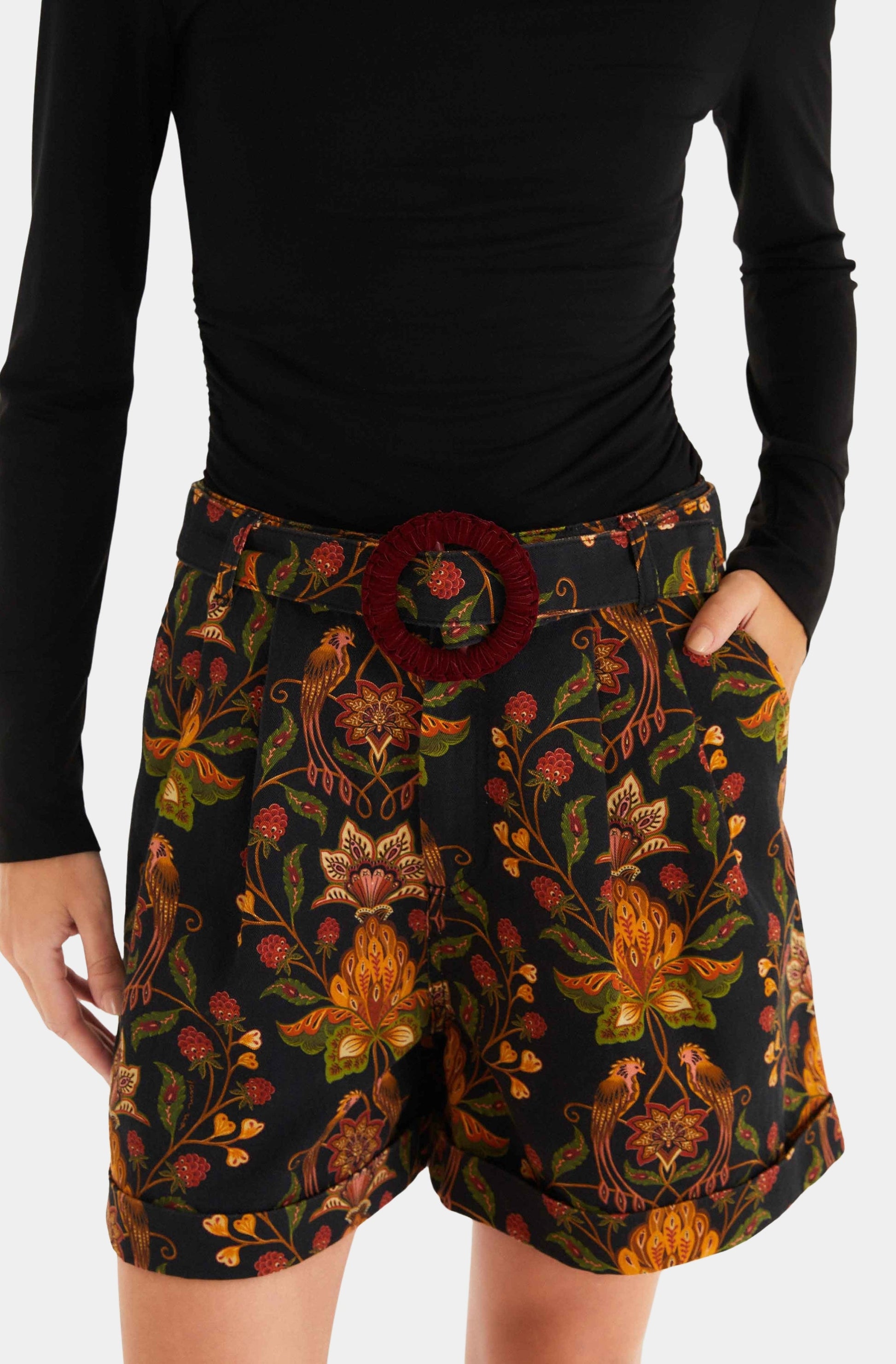 Bring the vibrant colors of the berry garden right to your wardrobe with these effortlessly chic printed shorts. The Berry Garden Black Shorts feature a relaxed, flattering fit, a folded hem, and an eye-catching O-ring belt for a stylish touch. Elevate your seasonal look with this versatile piece.
