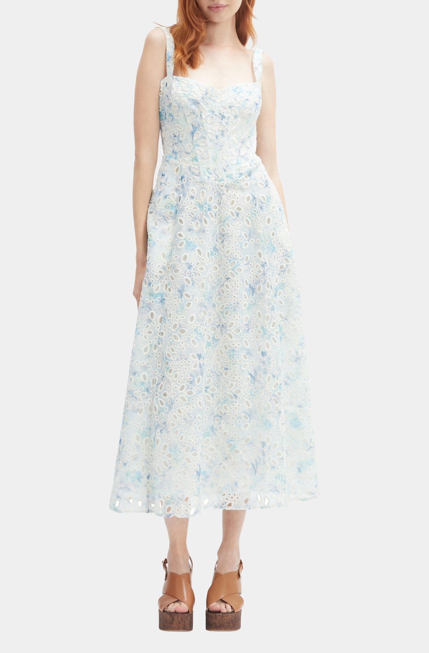 Embrace effortless elegance with the Adaline Broderie Midi Dress, a perfect addition to your summer wardrobe. This sleeveless dress features a captivating blue and white floral design, ideal for vacation getaways or sunny days out. Crafted for comfort and style, its lightweight fabric ensures you stay cool while looking chic. Elevate your seasonal look with this versatile piece that seamlessly transitions from day to night.
