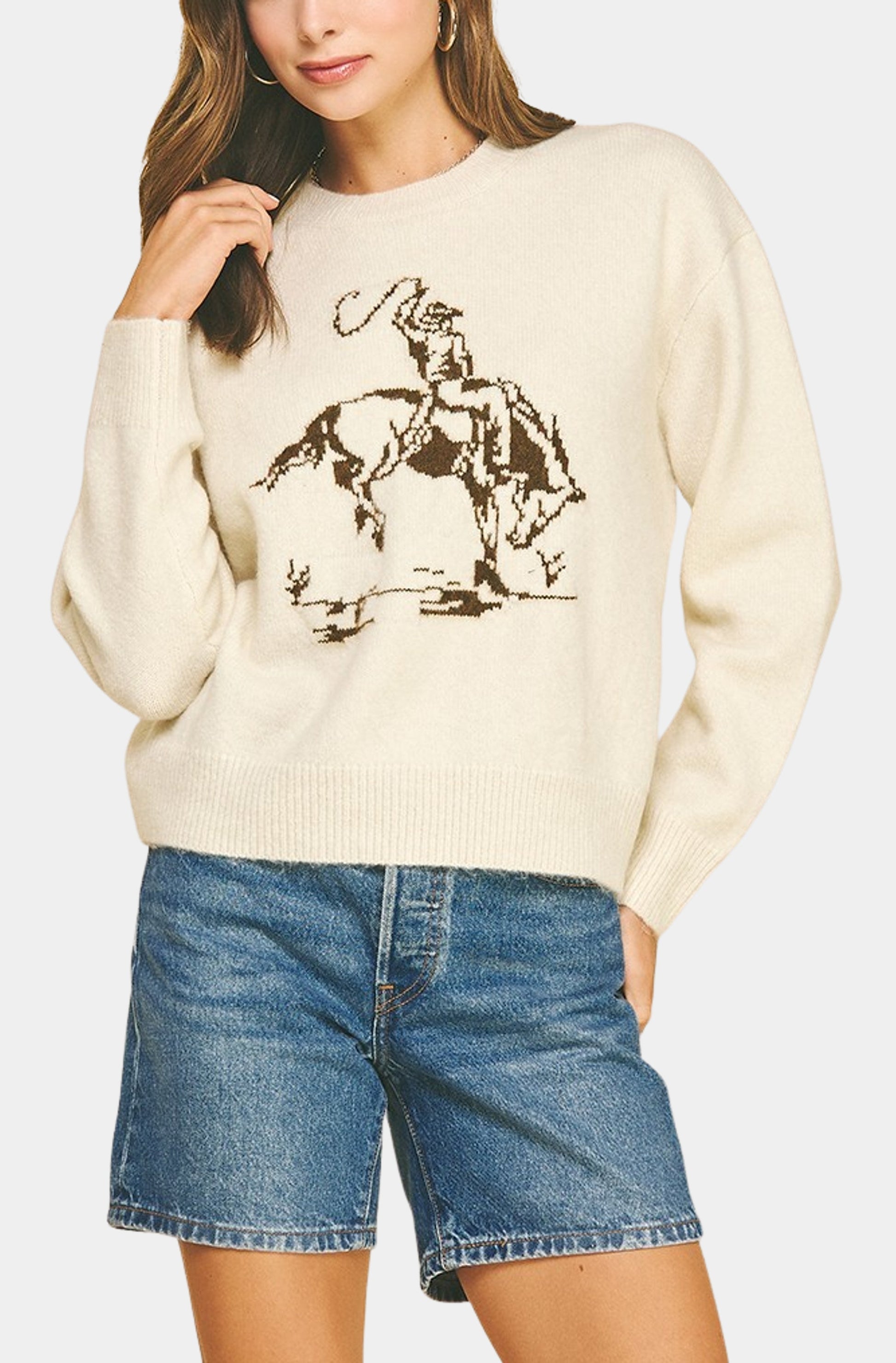 The Cassidy Sweater in ivory brings a western touch to your wardrobe with its rodeo print. Designed with a classic crew neck and long sleeves, this pullover is easy to layer and comfortable for everyday wear.