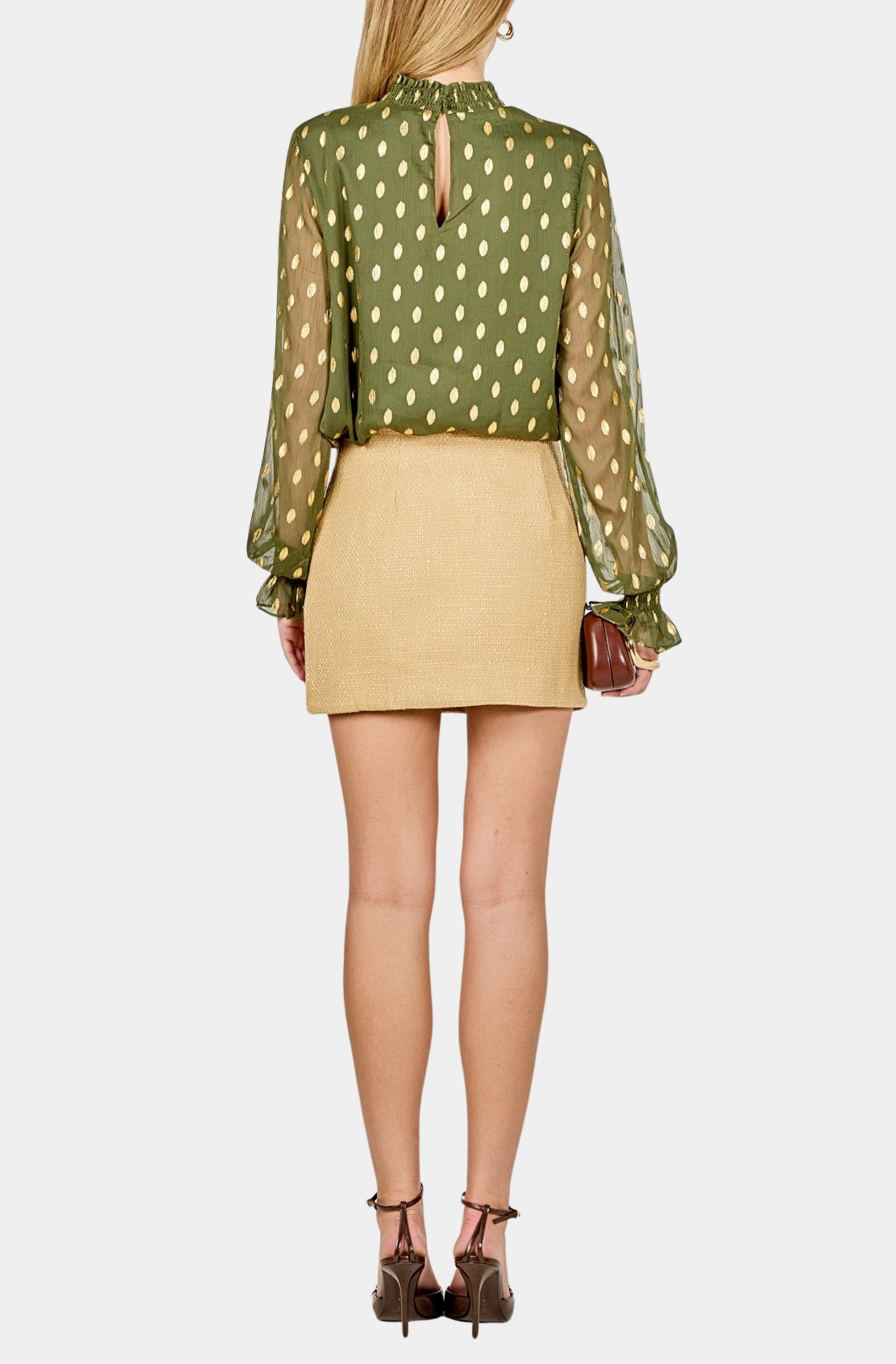 The Alma Blouse in green brings a touch of shine with its metallic dot chiffon. The mock neck and long sleeves offer a polished look, while the sheer, lightweight fabric keeps you comfortable from day to night. Ideal for work or evening plans.