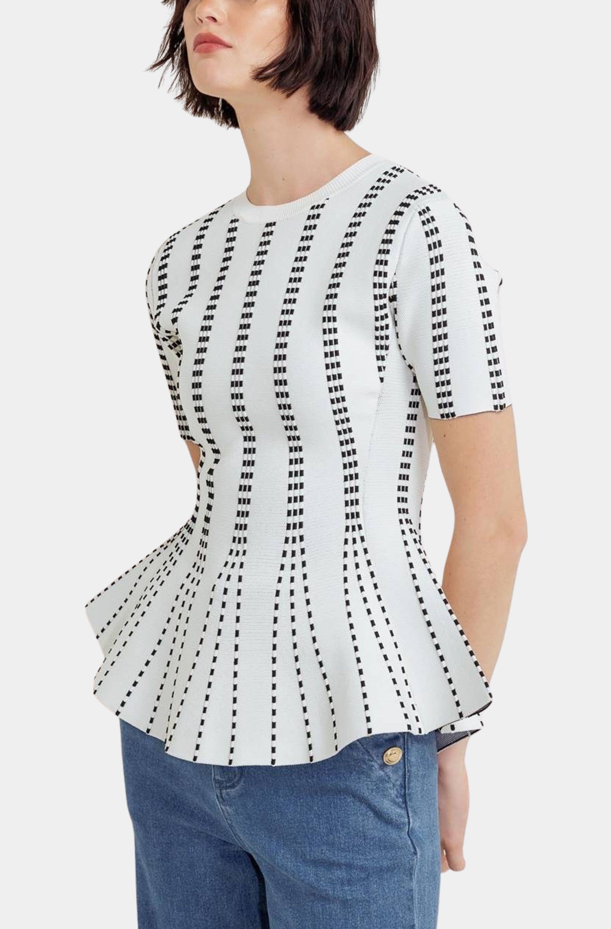 The Lydia Top blends a modern peplum silhouette with a round neckline and sleeveless cut. Its white and black compact knit design offers a fresh, versatile look that pairs well with jeans or skirts for daily wear.