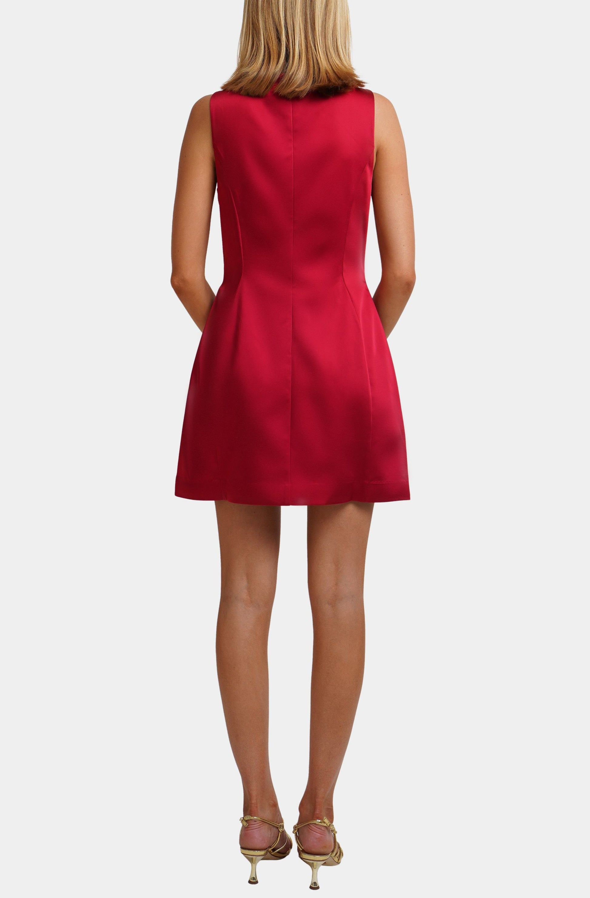 The Hemline Exclusive Alora Dress in Ruby is a modern mini dress with a sleek, fitted silhouette. Designed by Amanda Uprichard, this dress features clean lines for a refined look, making it a versatile choice for any occasion.