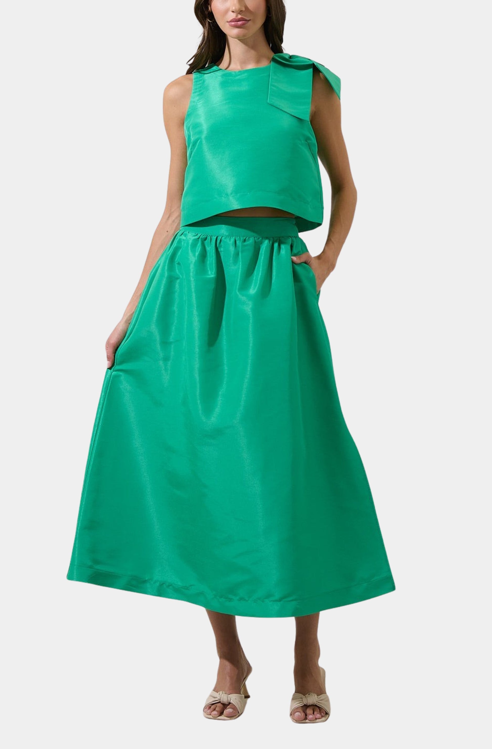 Add a pop of color to your wardrobe with the Tabitha Top in Kelly Green. This sleeveless crop top features a round neckline and a playful bow on the shoulder for a fun twist. The smooth satin taffeta fabric gives it a polished look, perfect for pairing with high-waisted jeans or skirts.