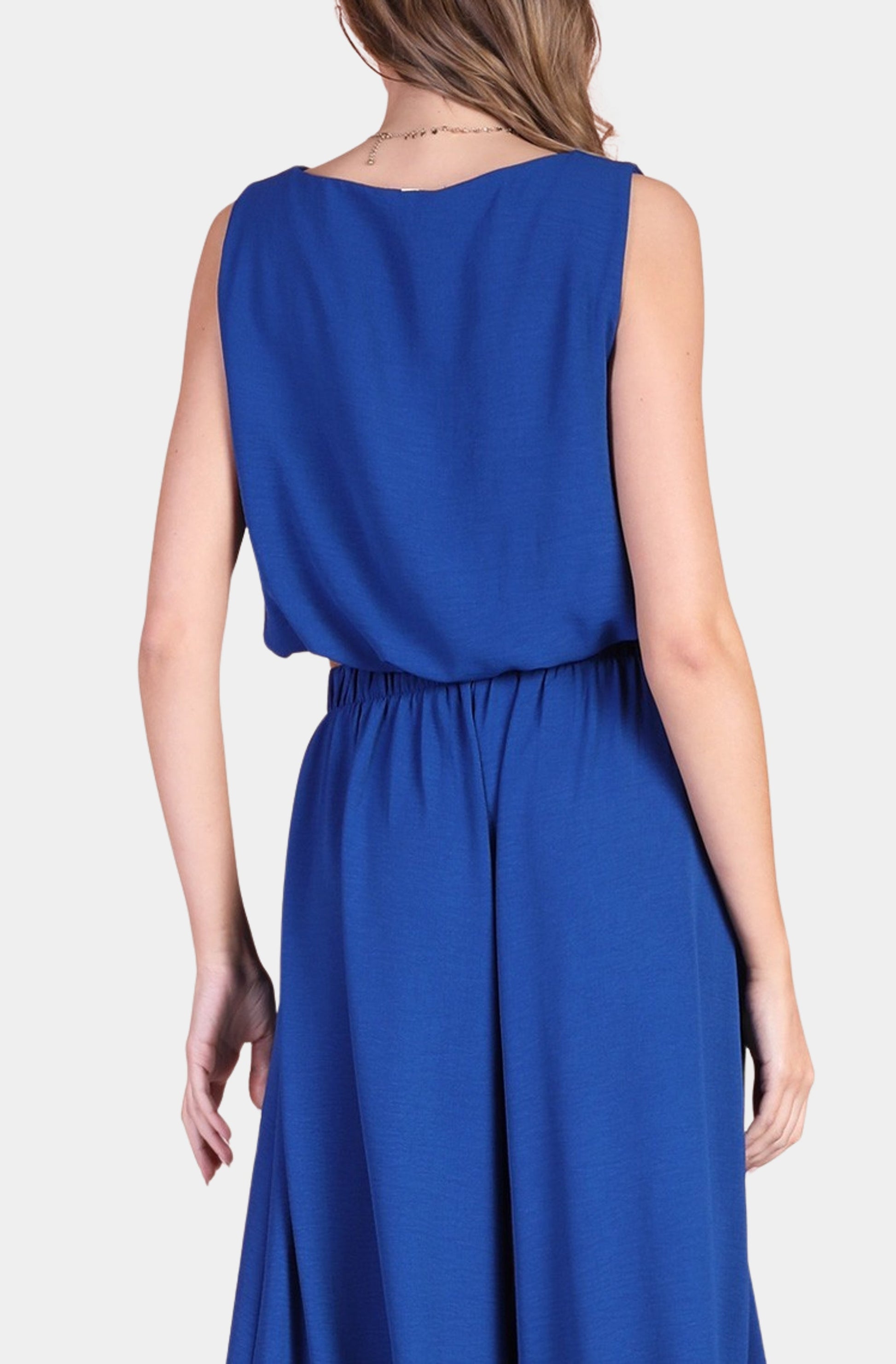 The Amber Top in royal blue offers a cropped, sleeveless style with a bubble hem for a fresh, modern look. Its smooth matte crepe fabric pairs well with high-waisted pants or skirts, making it a versatile choice for any outing.