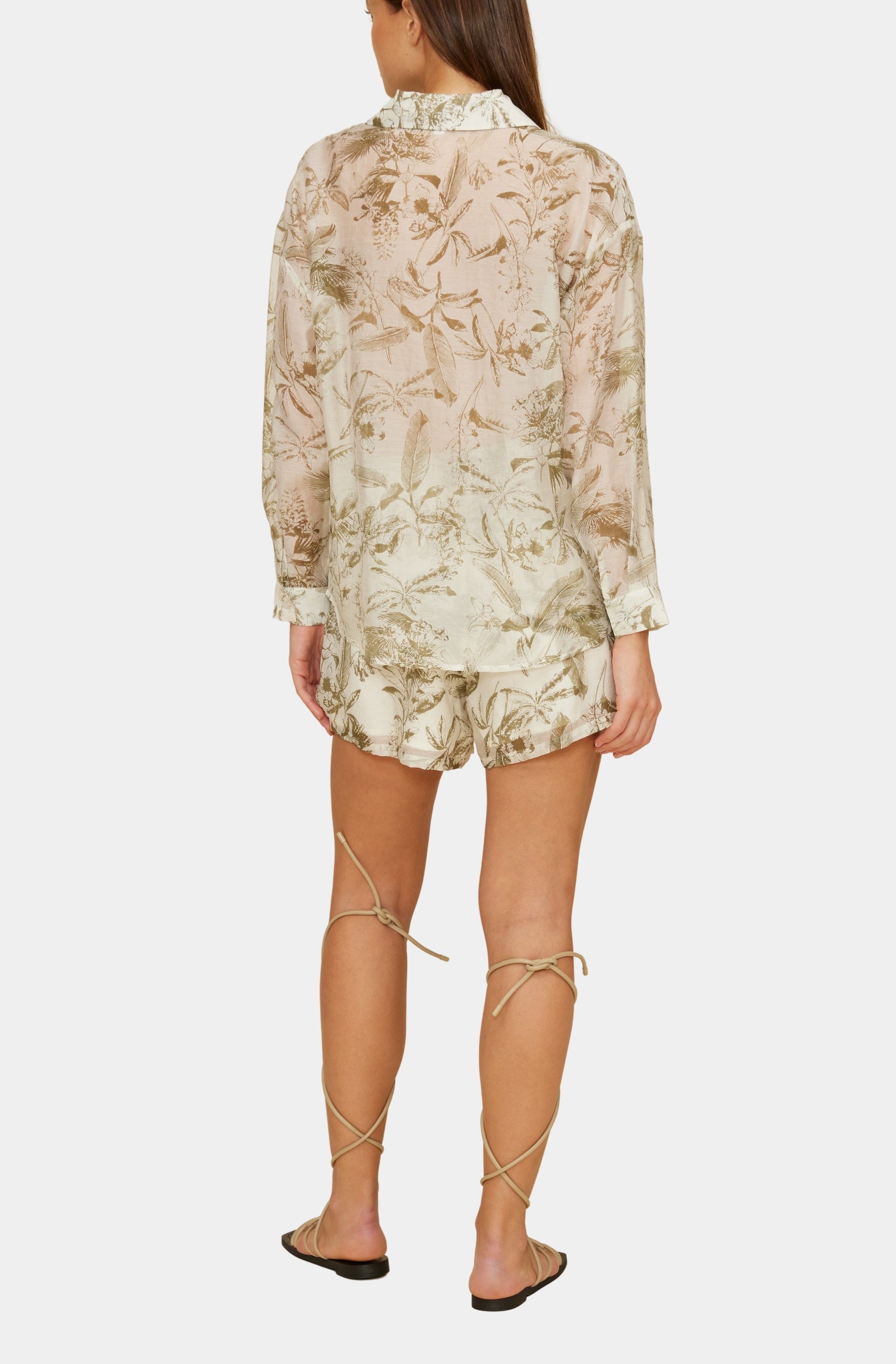 Elevate your wardrobe with the Renata Top in Ivory Olive, a chic addition that effortlessly combines style and comfort. Featuring a captivating palm print, this long-sleeve button-down is perfect for any occasion. Designed to pair seamlessly with the Renata Shorts, it offers a cohesive and fashionable look. Ideal for those who appreciate versatile and trendy pieces, this top is a must-have for your collection.